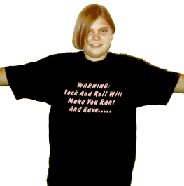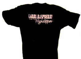 Larry Raspberry & The Highsteppers T-Shirt - Jet black, 50/50/ cotton-polyester, Screen Star T- shirts with hot pink lettering. Front says: "Warning: Rock & Roll Will Make You Rant and Rave......" Back says: "Larry Raspberry and The Highsteppers". Available in XL only. $30.00 each